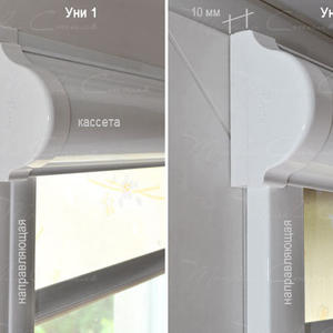 Рулонные шторы Uni-1 представляют собой систему кассетного типа, которая может использоваться как на пластиковых, так и на деревянных евроокнах со стеклопакетами. Она состоит из защитного короба, скрывающего механизм управления, боковых направляющих и натянутой между ними ткани шторы.
